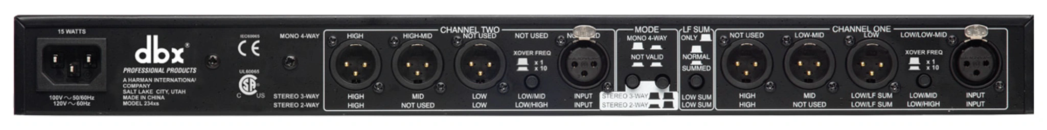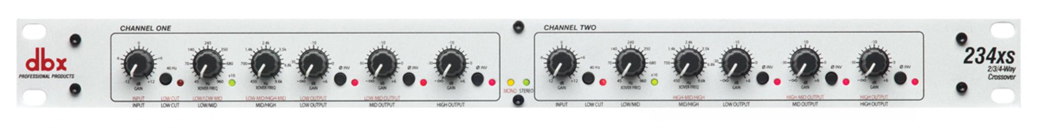 More sound to your amps and speakers The secret to making speakers sound great lies with the crossover you use. With the dbx® 234xs Crossover you'll get great performance, ultra low-noise, rugged reliability and four decades of dbx knowledge and expertise in building the world's finest processors. The 234xs uses precision filters to separate the audio signal and direct the correct frequencies to your loudspeaker drivers. By directing only the specific frequency bands to each speaker driver the 234xs leaves your amplifiers free to use their full power on the usable signal eliminating distortion and giving your PA system a cleaner and better sound. The dbx 234xs is a dual channel crossover with all the features you would expect from a professional product. It features Linkwitz-Riley 24dB per octave filters, independent output gain controls for level matching, output phase inversion, 40 Hz low cut filter, and optional mono summing of the low frequency (subwoofer) output. Everything in the design exudes great precision from the solid "click" controls to the high quality XLR inputs and outputs.