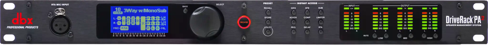 All you need to get the most from your PA. Now with complete control from your mobile device. The DriveRack® PA2 provides all the processing you need between your mixer and amplifiers to optimize and protect your loudspeakers. With the latest advancements in dbx’s proprietary AutoEQ™ and AFS™ algorithms, a new input delay module for delaying the FOH system to the backline, Ethernet control via an Android®, iOS®, Mac®, or Windows® device, and updated Wizards, the DriveRack PA2 continues the DriveRack legacy of great-sounding, powerful, and affordable loudspeaker management processors, for a whole new generation. AutoEQ™ New, improved AutoEQ algorithm ensures an extremely accurate, fast, and non-intrusive automatic EQ experience. With the RTA Mic “listening” to your room, the new, updated DriveRack PA2 AutoEQ algorithm sets speaker levels and room EQ automatically in a matter of seconds. This means room adjustments can now be made very quickly, without subjecting the audience to annoying, lengthy broadcasts of pink noise. Enhanced AFS™ Feedback Elimination Enhanced AFS™ algorithm for faster, more precise feedback elimination, without adversely affecting your system’s tone. Nothing turns audiences away like annoying and potentially painful audio feedback. Fortunately, dbx engineers have revisited their already-stellar Advanced Feedback Suppression algorithm and made it work even better. The DriveRack PA2 listens for and anticipates feedback and adjusts speaker output automatically before it even has a chance, while never altering your sound. Updated Wizard Setup Functions Updated Wizards make initial set up easy, while ensuring speaker tunings and other settings are up-to-date. Wizard functions on the DriveRack PA2 guide you through easy, step-by-step processes to help you get the most from your loudspeaker system. Helps you easily configure level balancing, AutoEQ, Advanced Feedback Suppression, and provides access to built-in and constantly updating speaker tunings from most major speaker manufacturers.