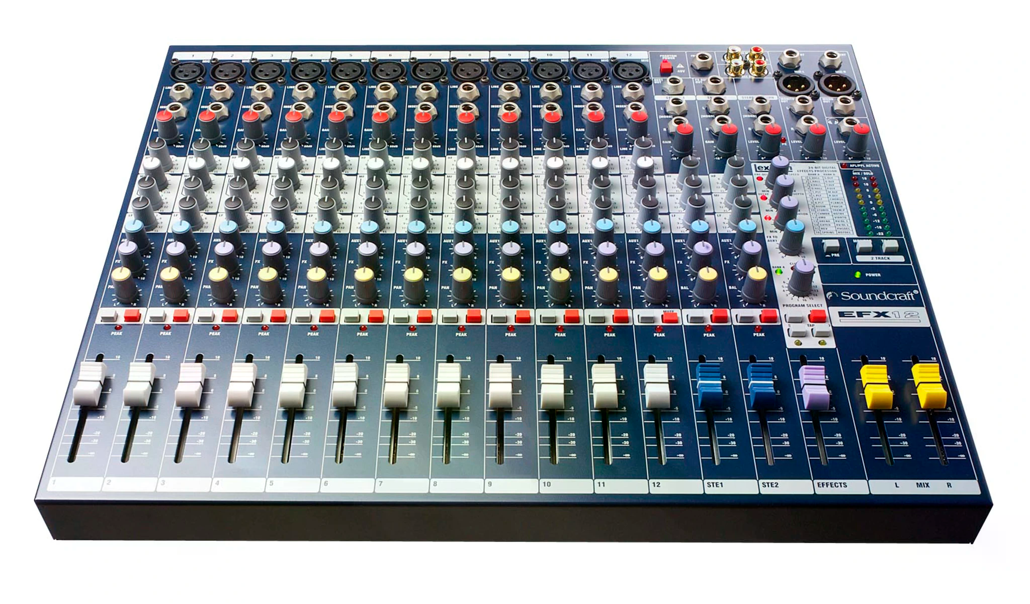 The Soundcraft EFX™ Series combines all the features of the popular Soundcraft EPM™ mixer with a built-in 24-bit, digital Lexicon® effects processor, expanding the Soundcraft low-cost, multipurpose compact range. Recommmended for: Sc checkHouses of WorshipSc checkMusic VenuesSc checkMusicians & BandsSc checkTheatres The Soundcraft EFX™ Series combines all the features of the popular Soundcraft EPM™ mixer with a built-in 24-bit, digital Lexicon® effects processor, expanding the Soundcraft low-cost, multipurpose compact range. The Soundcraft EFX mixer uses the same AudioDNA® processor featured in many of the Digitech® and Lexicon outboard equipment including the highly respected Lexicon MX400 processor. With over 35 years experience, the Lexicon name is synonymous with the best reverb and processing in the business, ensuring the finest quality effects not usually found in a console at this price level. The Effects section fits neatly into the mixers compact framework which is available in 8 or 12 mono input variants, both with 2 stereo channels and an effects send on each channel. There are 32 effects to choose from with a tap tempo function, 3 effects parameter controls and a user effects setting store facility. An effects channel level clip LED and Mute function gives the user even more flexibility. The emphasis with the Soundcraft EFX is very firmly on quality build and audio performance, with an easy to understand control surface in line with the Soundcraft professional range. The Soundcraft EFX uses the highly-transparent GB30 Mic amp (designed by Graham Blyth for the company’s 30th anniversary, and also used on the larger LX7ii and GB Series professional consoles).The Soundcraft EFX also offers all the features of the Soundcraft EPM most notably a configurable aux send, XLR and ¼" metal jack connector sockets, RCA phono stereo playback inputs and record outputs, 3-band EQ with a swept mid on the mono inputs, 3-band EQ on the 2 stereo inputs, TRS insert sockets, inserts on all mono inputs, ten-segment LED output metering and a headphone output. Features 8+2 and 12+2 channel frame sizes Built-in 24 bit Lexicon digital effects processor 32 FX settings Tap Tempo and FX setting store function 1 FX send on each channel 1 configurable auxiliary bus XLR-type and ¼” metal jack connector sockets RCA phono stereo playback inputs and record outputs 3-band EQ with a swept mid on mono inputs 3-band EQ on stereo inputs TRS insert sockets and inserts on all mono inputs Ten-segment LED output metering Intuitive and comprehensive solo system Headphone output Easily rack mountable Custom Karaoke preset The Soundcraft EFX will find itself in many applications including live music, recording, houses of worship and multi-speaker installations.