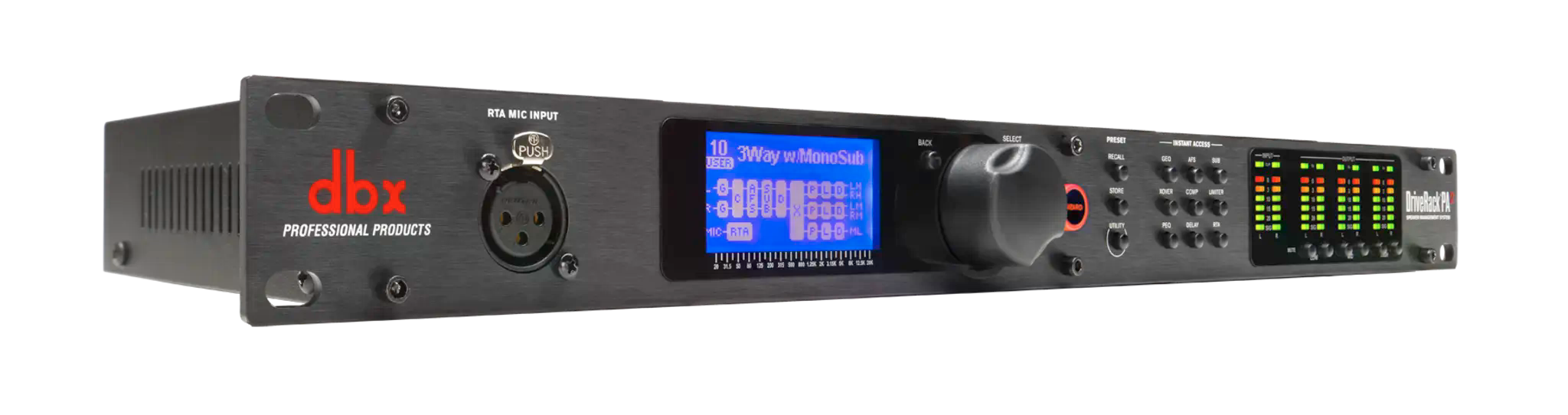 All you need to get the most from your PA. Now with complete control from your mobile device. The DriveRack® PA2 provides all the processing you need between your mixer and amplifiers to optimize and protect your loudspeakers. With the latest advancements in dbx’s proprietary AutoEQ™ and AFS™ algorithms, a new input delay module for delaying the FOH system to the backline, Ethernet control via an Android®, iOS®, Mac®, or Windows® device, and updated Wizards, the DriveRack PA2 continues the DriveRack legacy of great-sounding, powerful, and affordable loudspeaker management processors, for a whole new generation. AutoEQ™ New, improved AutoEQ algorithm ensures an extremely accurate, fast, and non-intrusive automatic EQ experience. With the RTA Mic “listening” to your room, the new, updated DriveRack PA2 AutoEQ algorithm sets speaker levels and room EQ automatically in a matter of seconds. This means room adjustments can now be made very quickly, without subjecting the audience to annoying, lengthy broadcasts of pink noise. Enhanced AFS™ Feedback Elimination Enhanced AFS™ algorithm for faster, more precise feedback elimination, without adversely affecting your system’s tone. Nothing turns audiences away like annoying and potentially painful audio feedback. Fortunately, dbx engineers have revisited their already-stellar Advanced Feedback Suppression algorithm and made it work even better. The DriveRack PA2 listens for and anticipates feedback and adjusts speaker output automatically before it even has a chance, while never altering your sound. Updated Wizard Setup Functions Updated Wizards make initial set up easy, while ensuring speaker tunings and other settings are up-to-date. Wizard functions on the DriveRack PA2 guide you through easy, step-by-step processes to help you get the most from your loudspeaker system. Helps you easily configure level balancing, AutoEQ, Advanced Feedback Suppression, and provides access to built-in and constantly updating speaker tunings from most major speaker manufacturers.